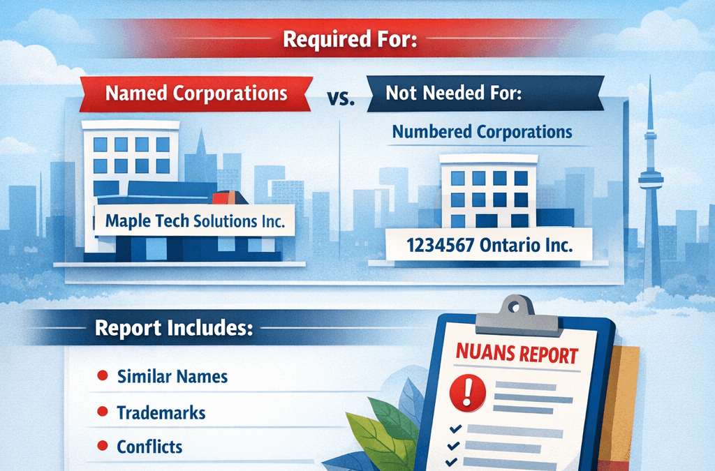 Infographic explaining what a NUANS search is in Canada, including named vs numbered corporations and 90-day validity.